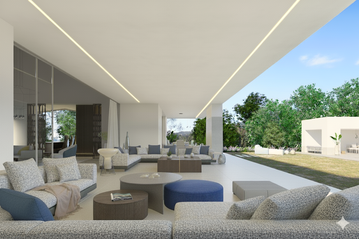 Esta residencia de vacaciones ha sido proyectada con una arquitectura moderna donde destacan amplios espacios que juegan con la luz mediterránea. Techos altos permiten incluir bonitas luminarias y detalles cálidos que incluyen la madera o piedra en consonancia con el ambiente de Sotogrande.